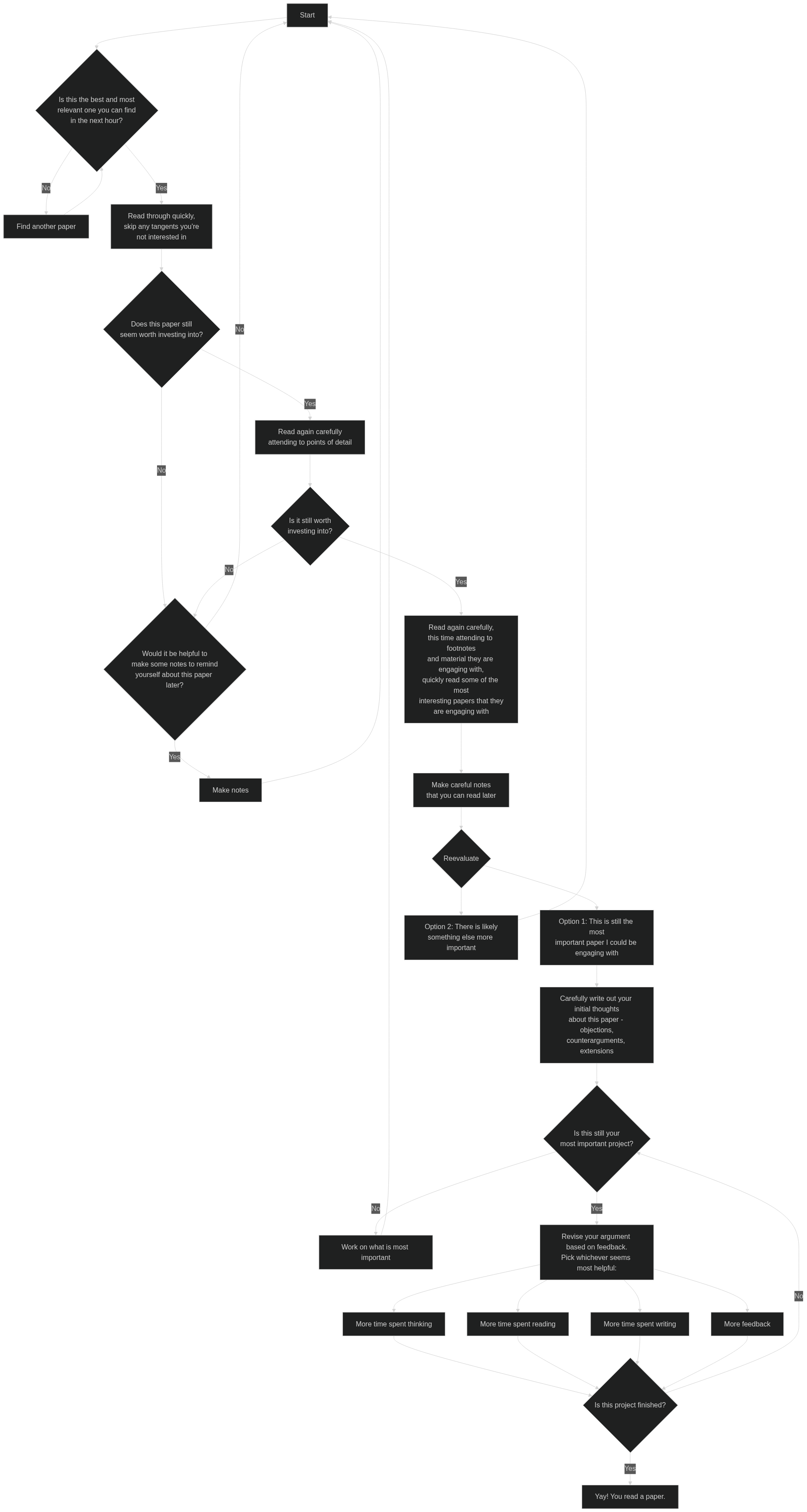 J -->|Yes| K[Read again carefully,<br/>this time attending to footnotes<br/>and material they are engaging with,<br/>quickly read some of the most<br/>interesting papers that they<br/>are engaging with]