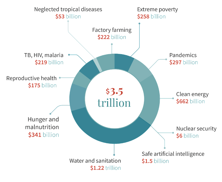 The answer is surprising: in just the first year, this would result in an increase of at least $3.5 trillion over and above what already goes to charity each year. If these resources were deployed to solve some of the world’s most pressing problems, in just one year we could achieve the following: